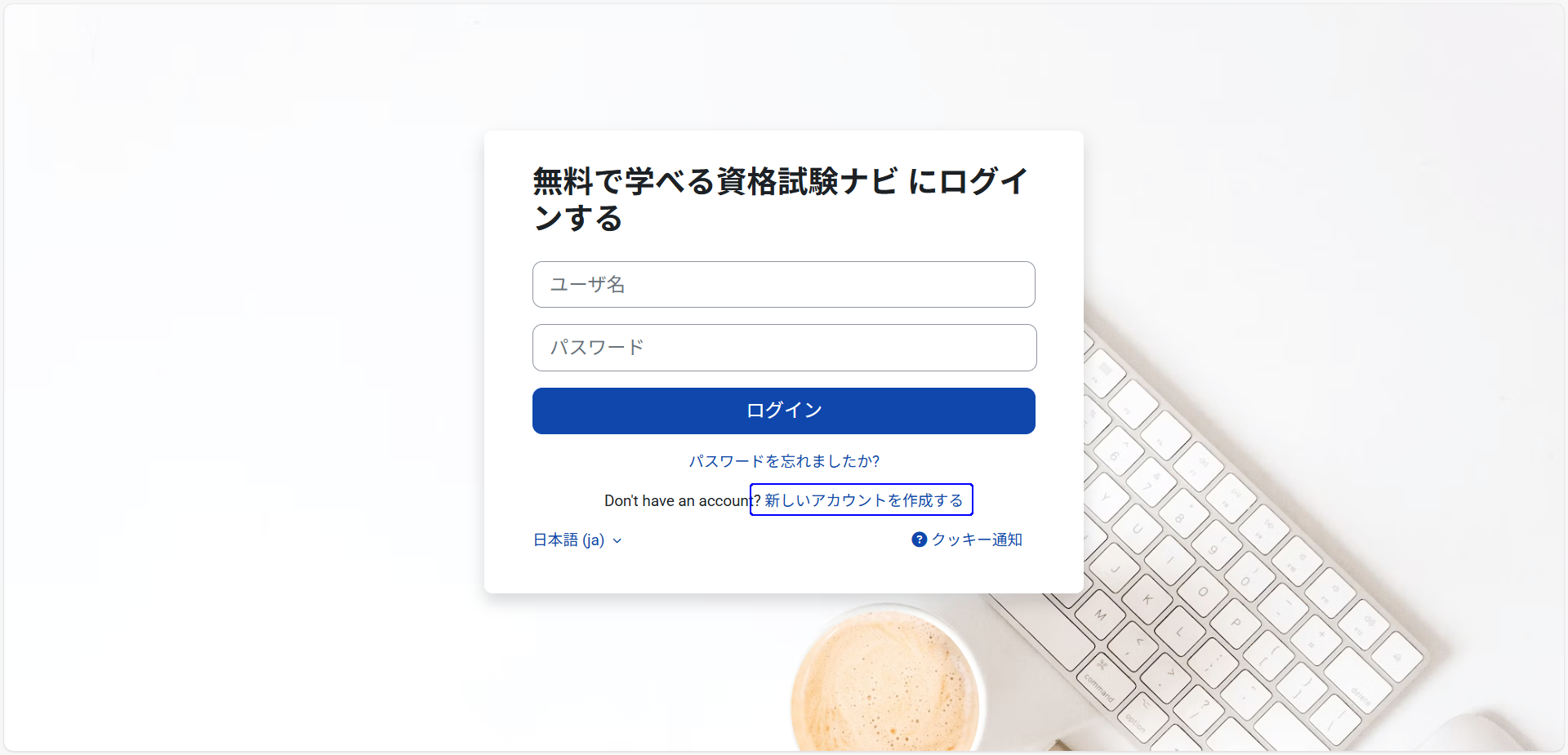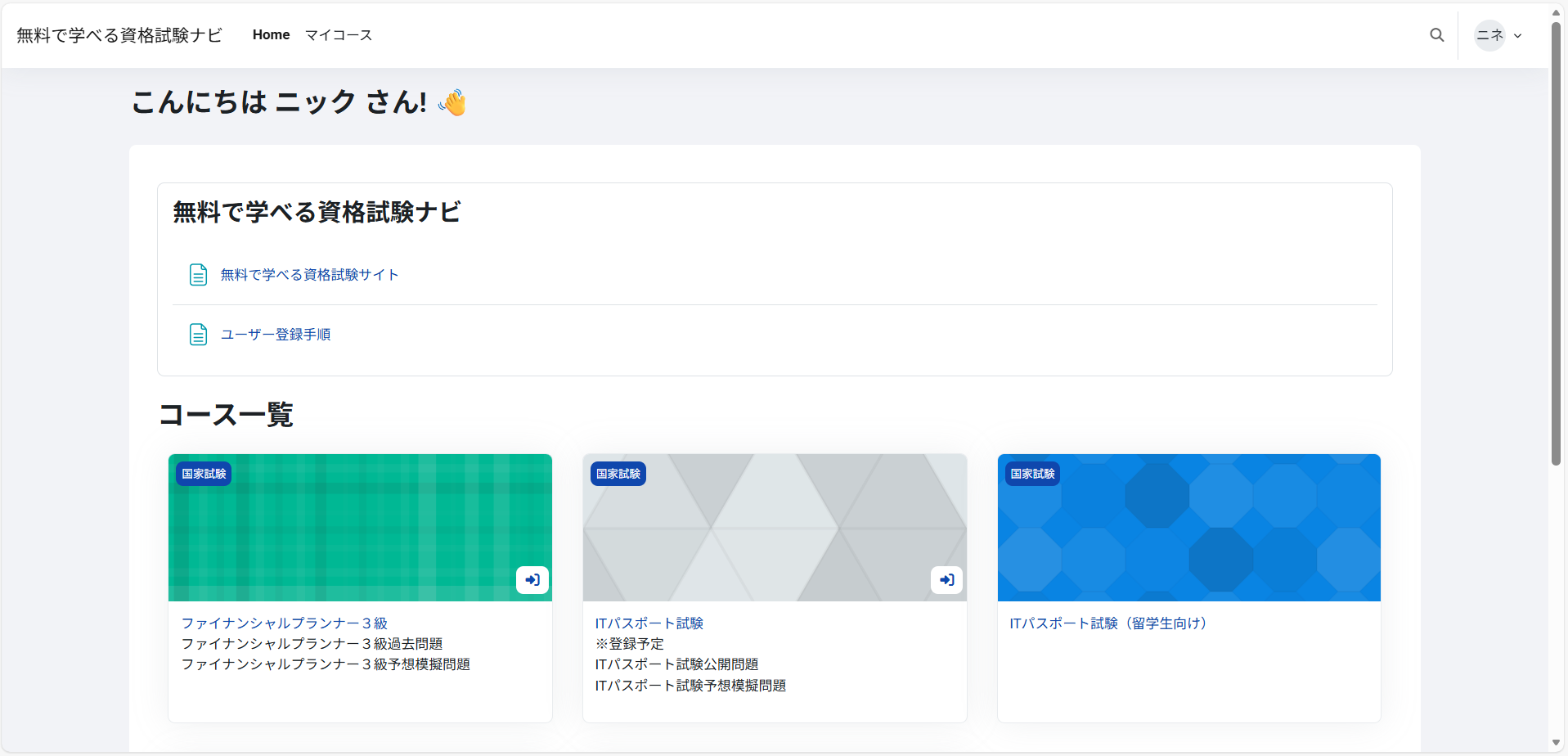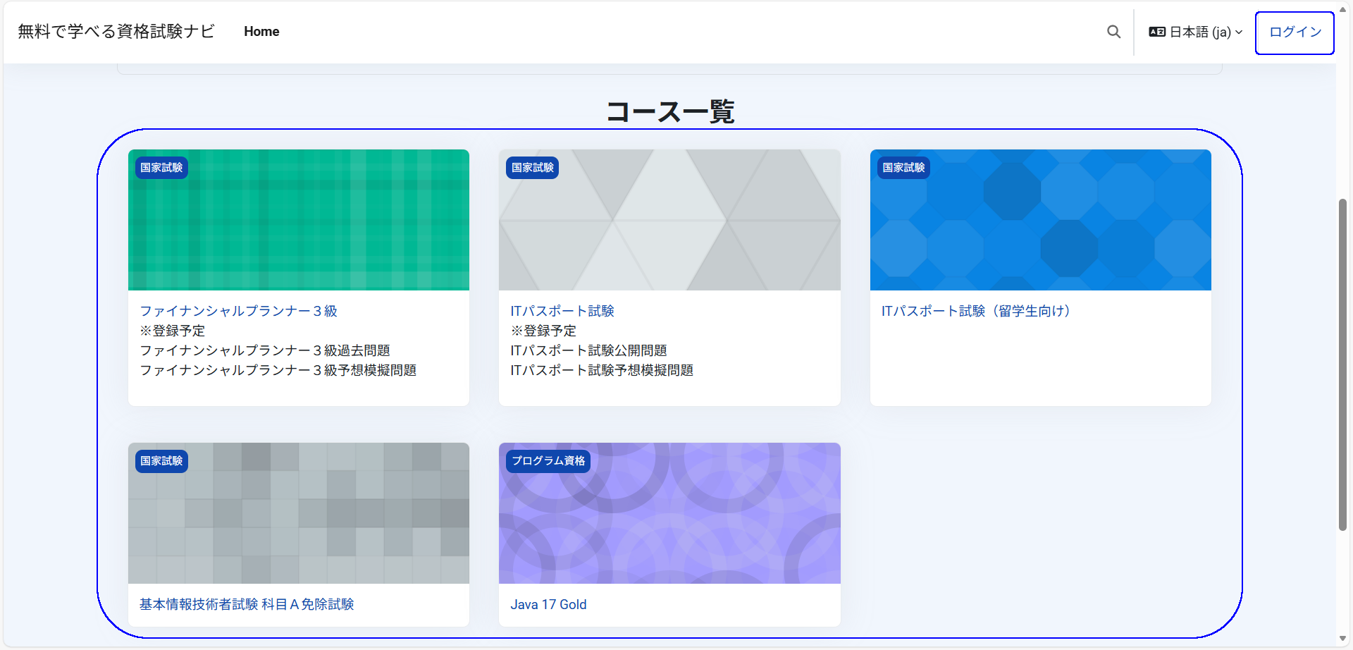 下の図のように、メインページの画面でコース名または右上にある「ログイン」をクリックしてください。