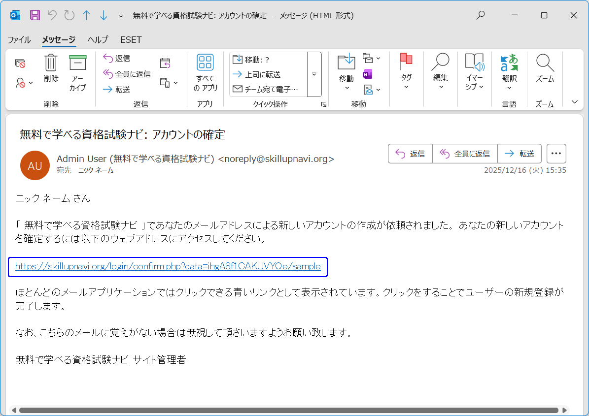 登録されたメールアドレスに下の図のようなメールが送られますので、メール文章中のリンクをクリックします。